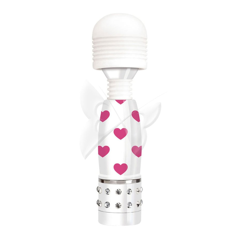 The BodyWand Fashion Edition Sweetheart mini massage wand is adorably patterned in white with pink hearts and bling.