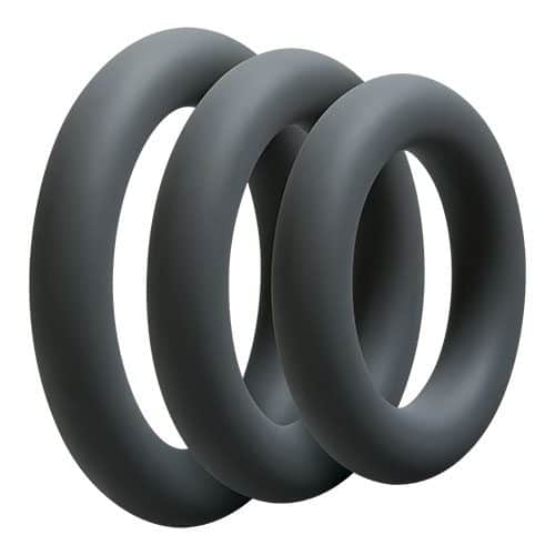 For larger erections, longer lasting erections and prolonged ejaculation, the OptiMALE 3 C Ring Set Thick (slate) stretchy cock rings won’t disappoint.